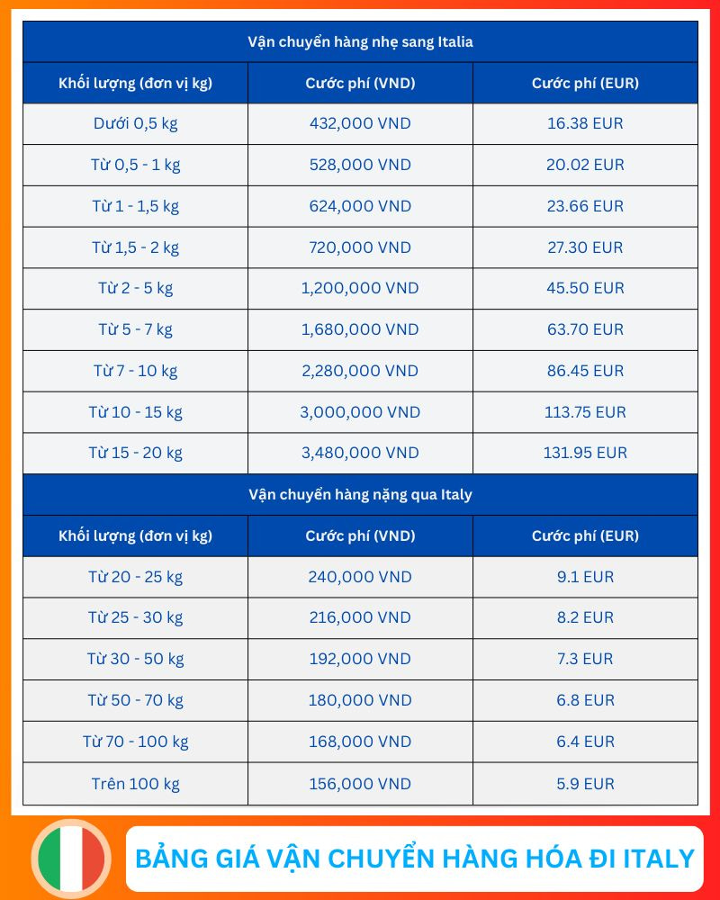 Tham khảo bảng giá gửi hàng hóa đi Ý giá rẻ 2025 tại đây: